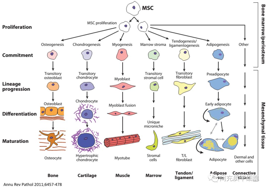 2000年《nature medicine》采用人骨髓MSCs子宮內(nèi)注射到孕65天和85天的羊胎(相當(dāng)于145天的人胎)的腹膜腔,移植后長達(dá)13個月的時間內(nèi)在多個組織中存活,而且移植后的人MSCs在體內(nèi)分化為軟骨細(xì)胞、脂肪細(xì)胞、心肌細(xì)胞和心肌細(xì)胞、骨髓基質(zhì)細(xì)胞和胸腺基質(zhì)細(xì)胞;這研究結(jié)果直接證明了MSCs的多項分化潛能[30]。