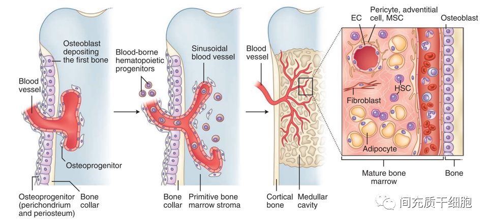 血竇是骨髓中三維血管周圍基質(zhì)間隔的一部分,在骨骼的器官形成過程中起源于原始軟骨膜上的成骨細(xì)胞,并與生長的血管一起侵入骨底,形成造血干細(xì)胞的微環(huán)境(niche)(圖)。