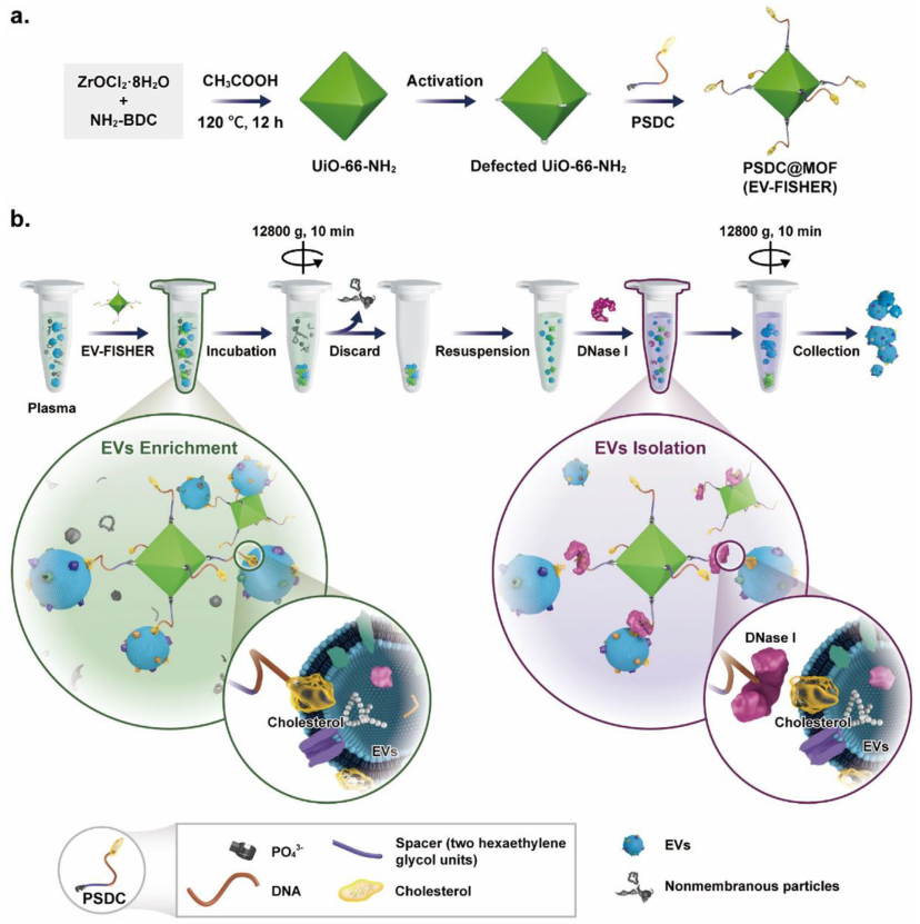 在此,該研究報告了一個稱為EV-FISHER的MOF平臺,用于EVs 的快速富集和分離。由于這種分離策略的精巧設計,所提出的基于MOF的EV分離平臺可以在可用的商業(yè)試劑的臨床實驗室中重復使用。這項工作為在一般臨床實驗室中快速有效地分離血漿EV以進行下游分析提供了一種有前途的策略。